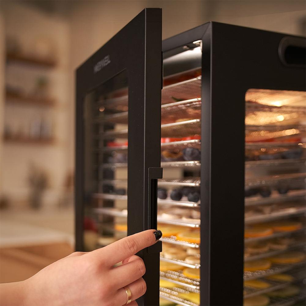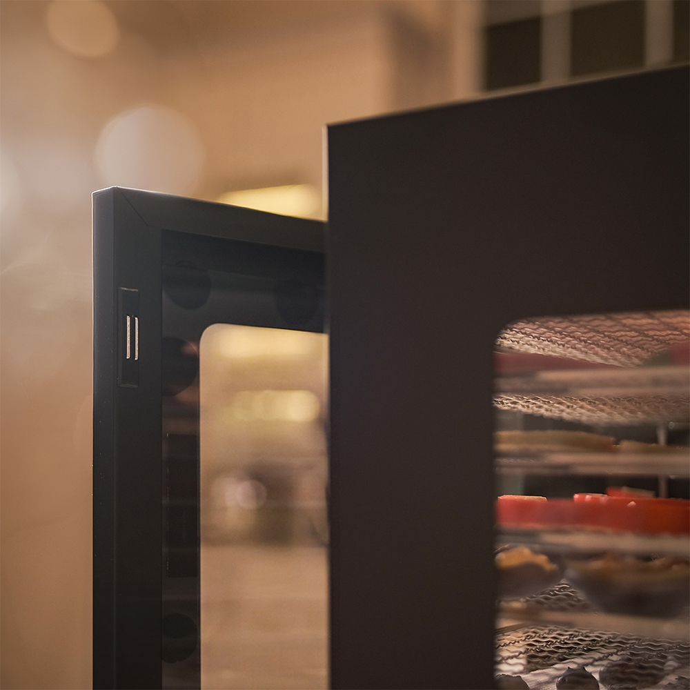 Чёрный корпус из нержавеющей стали, устойчивый к нагреву, влаге и коррозии, выглядит лаконично и современно, легко вписывается в интерьер кухни или мастерской. Внутри установлено 14 поддонов из нержавеющей стали с зазором 25 мм — этого достаточно, чтобы удобно размещать ломтики фруктов, травы или мясные полоски.