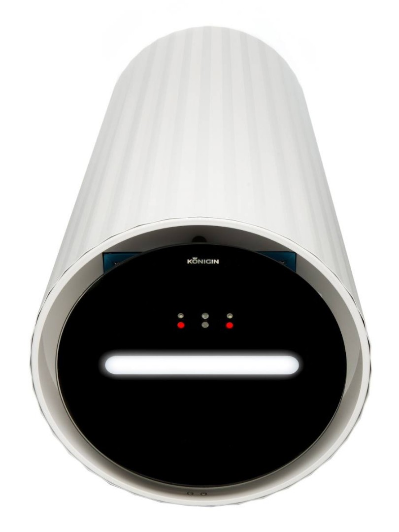 Данная модель оснащена системой управления, распознающей движения рук (жесты) под вытяжкой на стеклянной декоративной панели. Светодиодный индикатор, отображает текущую скорость работы вытяжки определенным цветом (синий, фиолетовый, зеленый, красный). Цвет диода отображается на поверхности варочной плиты, расположенного под вытяжкой.