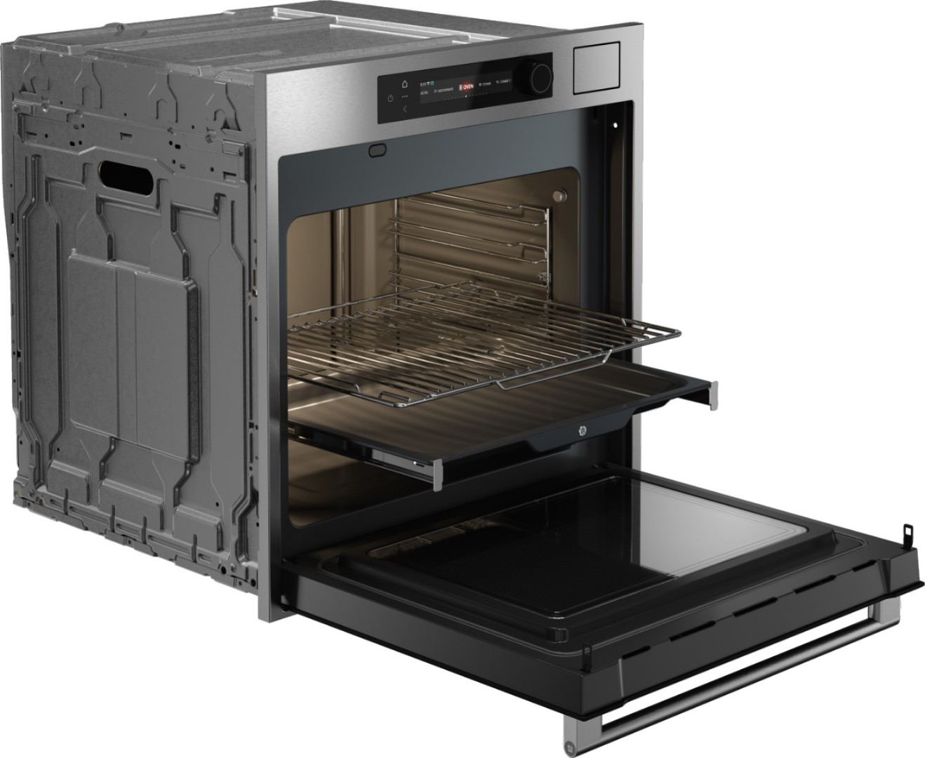 - Комплектация: 2 х универсальных противня, 1 х противень из нержавеющей стали с перфорацией, 1 х противень из нержавеющей стали без перфорации, 1 х решетка, 1 х стеклянный противень, 1 х термозонд