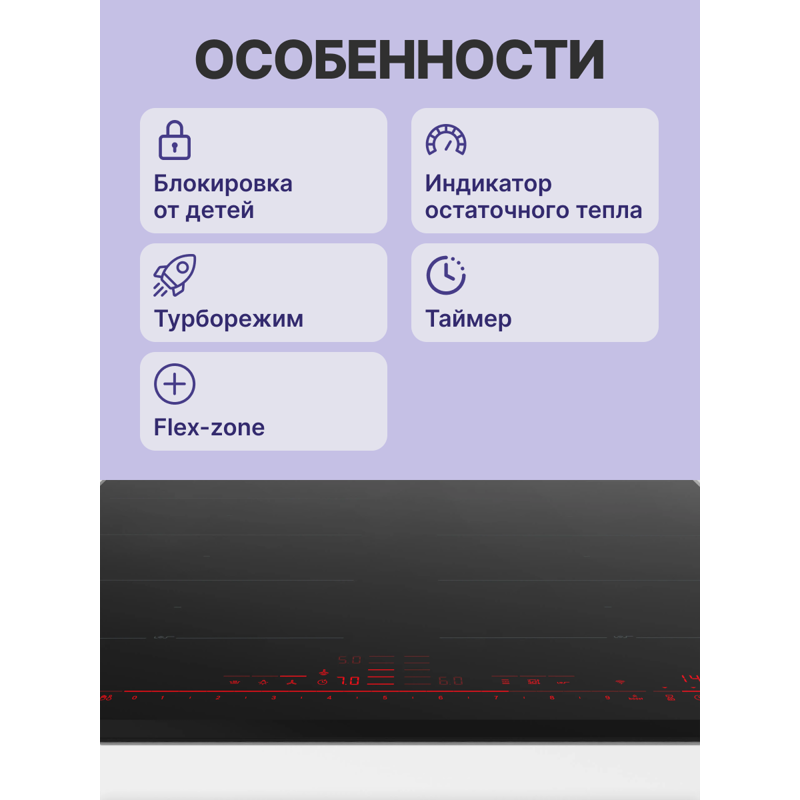 - Безопасность: Блокировка панели управления; Защитное отключение; Индикация остаточного тепла
