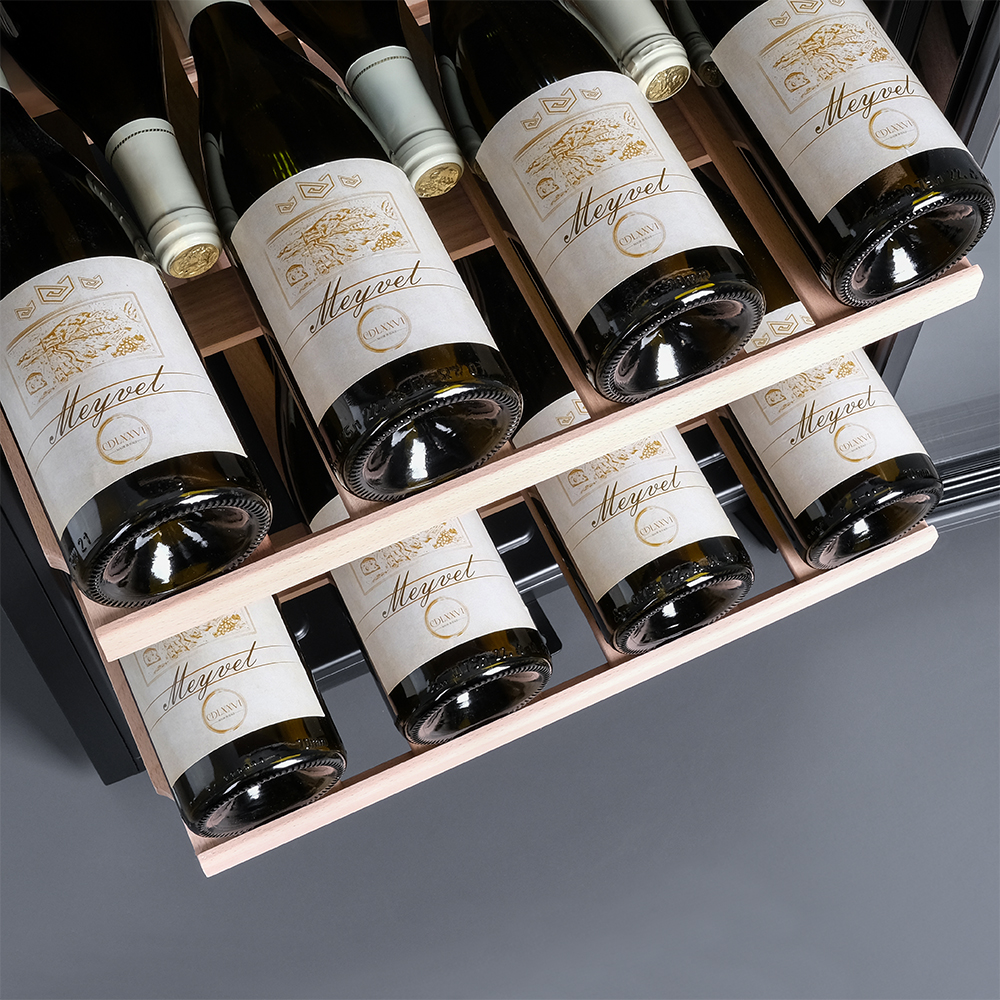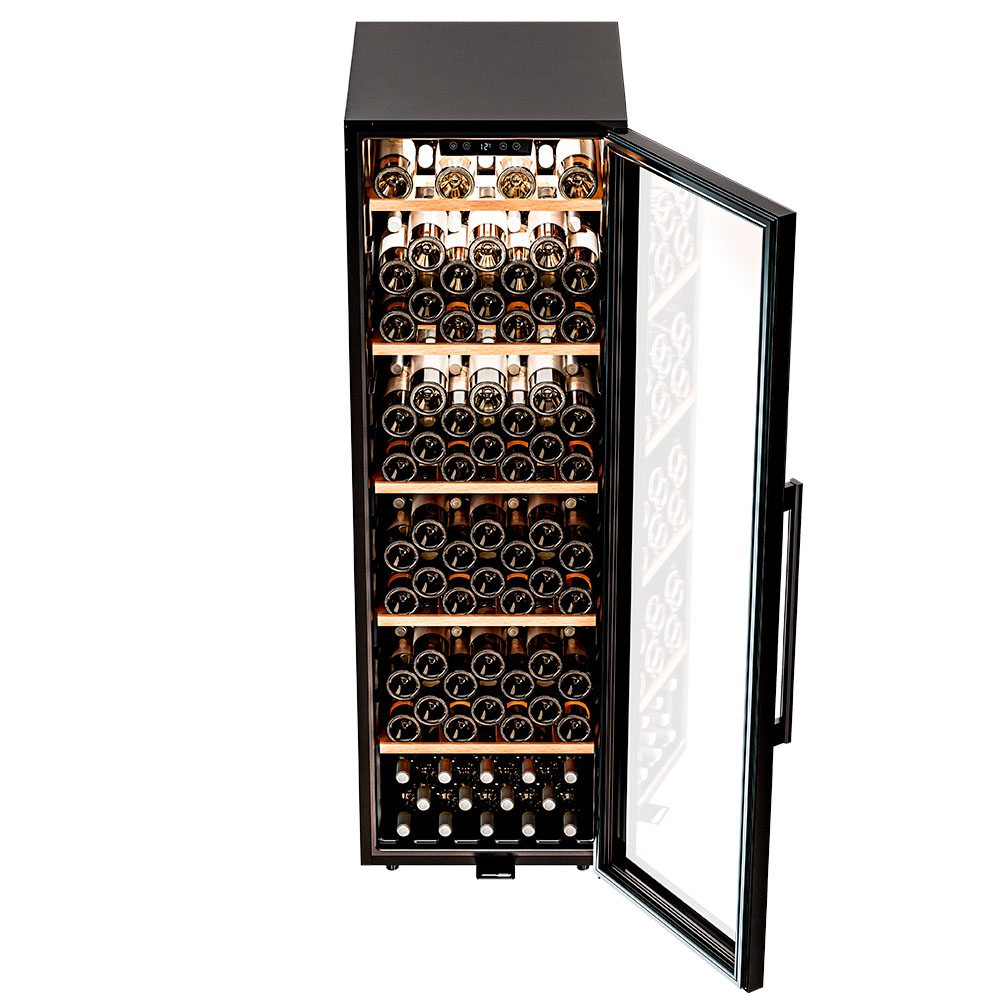 Модель оснащена пятью полками из дерева, что не только выглядит стильно, но и способствует правильной циркуляции воздуха внутри шкафа. Дополнительно можно установить до 8 полок, а также приобрести демонстрационную полку и полку для фужеров. Тройное стекло с УФ-фильтром надежно защищает вино от вредного воздействия света, что сохраняет его уникальный вкус и аромат.