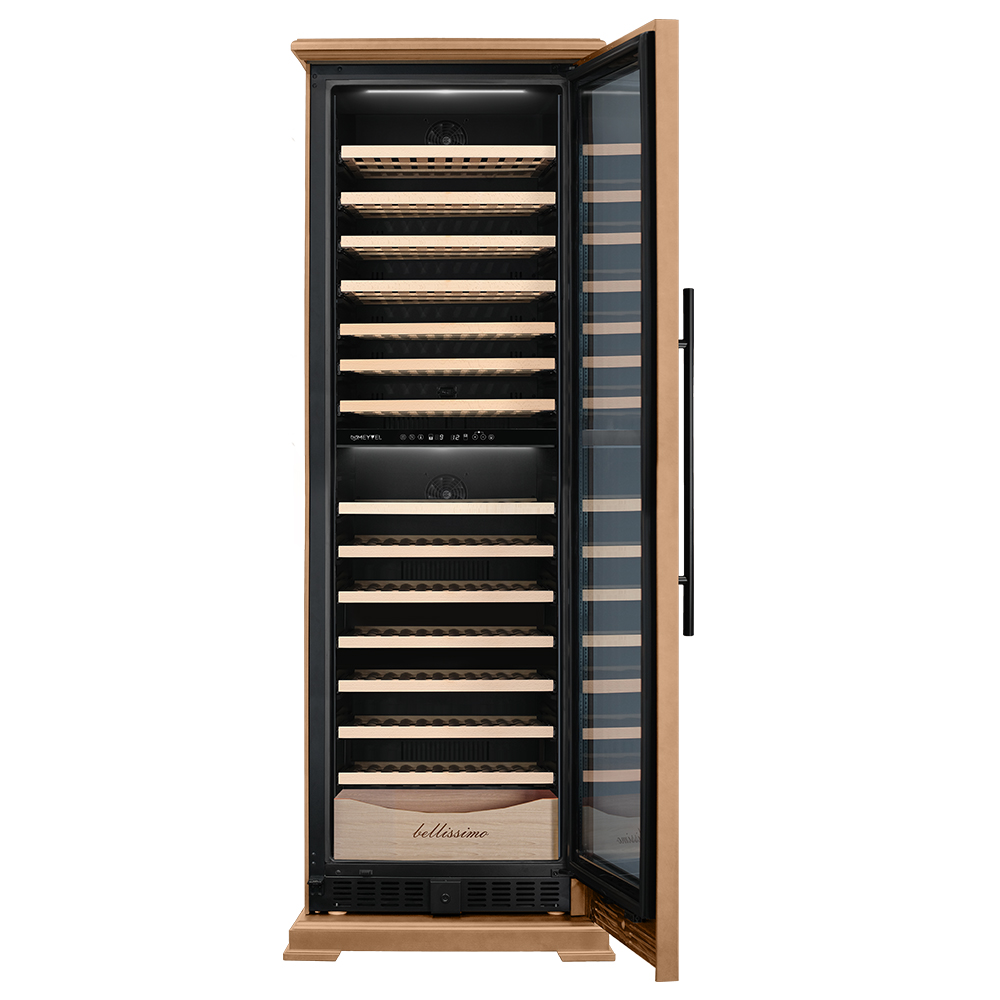 Винный шкаф предназначен для профессионального и длительного хранения различных сортов вин (до 174 бутылок типа Бордо). Он так же оснащен дверью с защитой от ультрафиолетовых лучей и поддерживает влажность в диапазоне 60-80%, как в настоящем винном погребе. Стальной корпус обшит натуральным буком, который выдерживает большие нагрузки и обладает красивой текстурой.