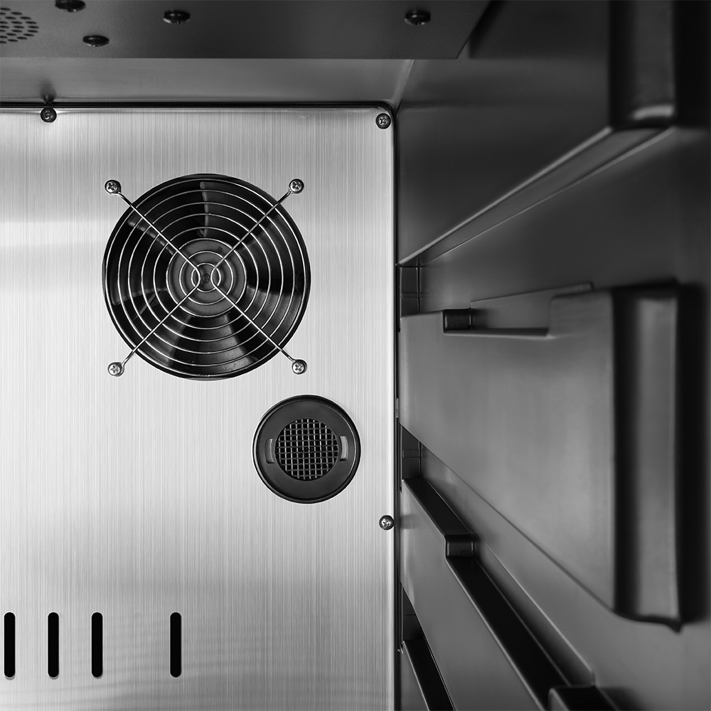 Внутреннее оснащение холодильника продумано до мелочей. Регулируемые ножки позволяют выровнять устройство, а встроенные крюки, поднос для соли и полки из нержавеющей стали облегчают размещение и сушку содержимого. Резервуар для воды дает возможность контролировать уровень влажности в диапазоне от 60 до 85%, что важно для равномерного вызревания.